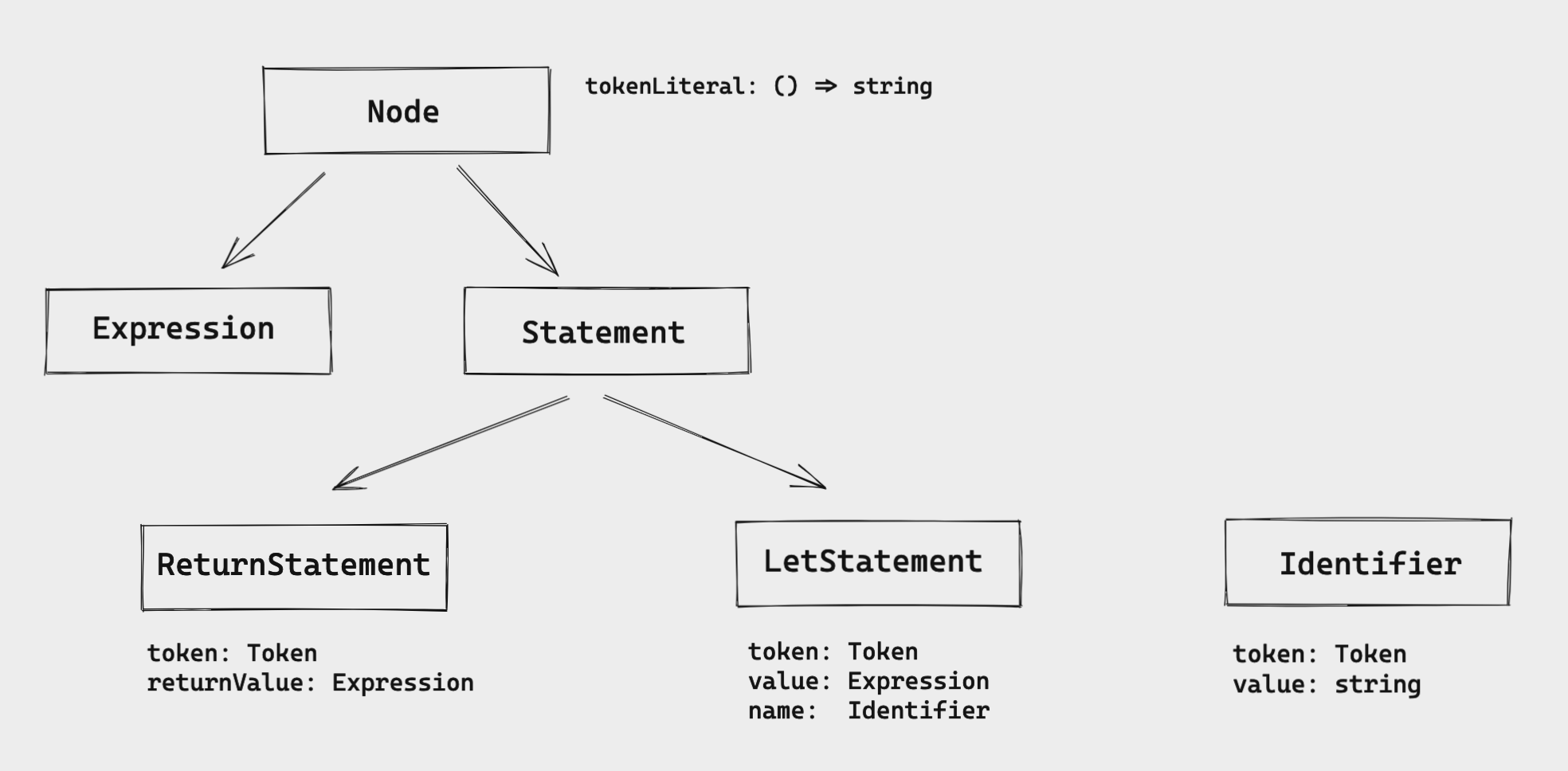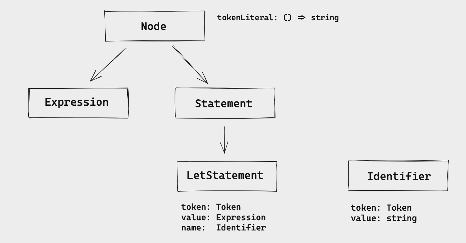 We start with "everything is a node". Then we have the two main interfaces: Expression and Statement. In this case, LetStatement implements the Statement interface.
